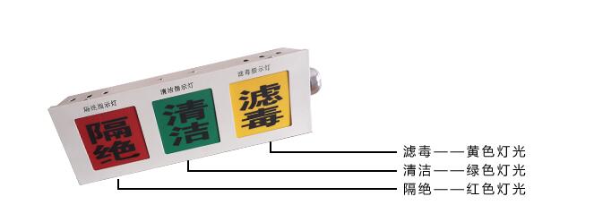 人防信號燈箱主要對三種空氣質(zhì)量情況進行報警:清潔、隔絕、濾毒。燈箱分別用三種顏色的燈光來對三種不同空氣情況報警:清潔——綠色燈光;隔絕——紅色燈光;濾毒——黃色燈光。